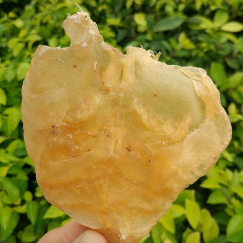 一般养殖的花胶(同上,赤嘴和白莲是多的)在同个品种下,纹路会比野生的少一些,比较光滑,而且肉相对较薄,颜色相对较透,肉质也不如野生的好,还有另外一个更加直观的判断就是,养殖的花胶一般同一批个头都长的差不多大小,而且也的漂亮,因为养殖的赤嘴每天销售的数量是一定的(尤其针对那些一个几十克左右的花胶,不可能把全部养的赤嘴鳘鱼全部杀光,然后取下鱼鳔吧?那那些鱼肉怎么办),所以人工剖晒的比是较讲究;而野生的花胶同批货个头大小差异都比较大,而且剖的手法也不一哦.